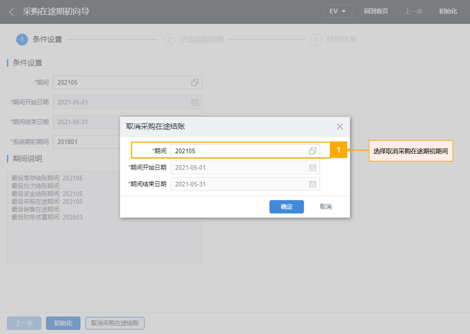 1.以进行2021年5月份采购在途期初为例,期间选择202105。