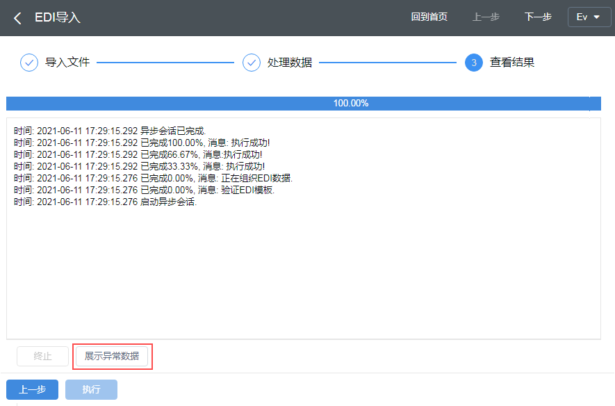 数据开始导入,当前页面展示数据导入的情况。如果有数据导入失败,可以点击异常数据查看,将失败的数据导出到Excel文件,进行调整后再重新导入。
