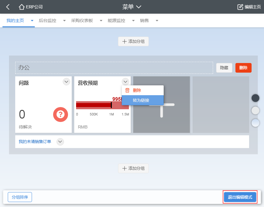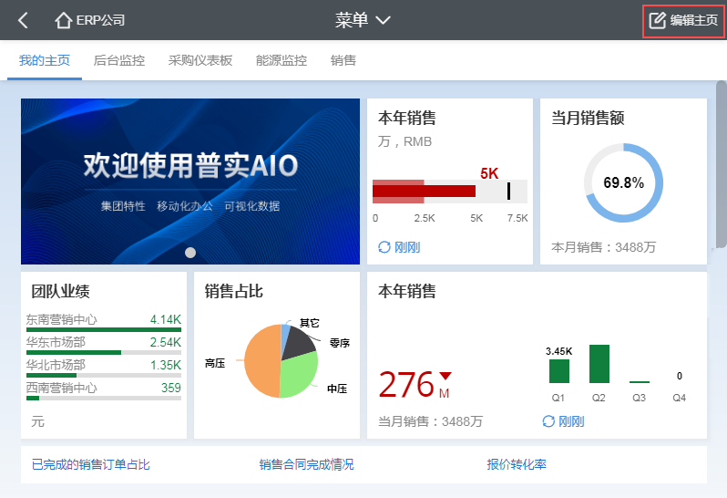 我的主页是唯一一个通过磁贴(大大小小的方块)的方式展示数据和链接的桌面标签页,默认情况下,这个页面是用户登录AIO8系统后的第一个页面。