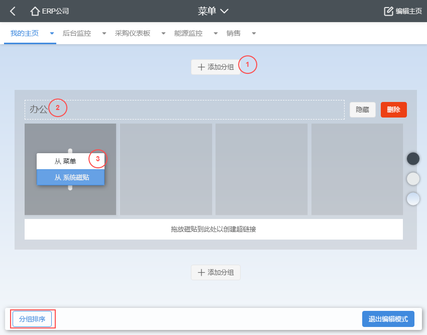 我的主页中的磁贴,有两部分组成,一部分是由岗位设置根据当前用户的默认岗位推送给用户的,这部分磁贴用户自己是无法调整的,只能由管理员来调整(详细内容参见岗位桌面)。另一部分磁贴是由用户自己根据需要添加到自己桌面上的,具体操作见下方的编辑主页。需要注意的是,为了保证展示的一致性,从使用上来看,这两种来源的磁贴看起来是完全一样的,只是在用户编辑自己的主页时发现消失不见的那些磁贴就是岗位推送的。