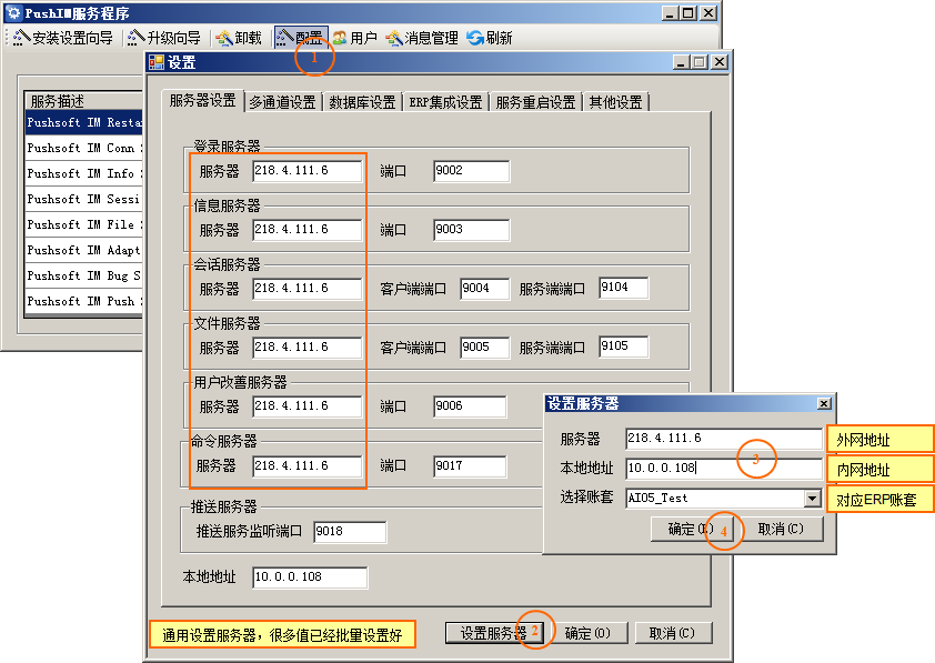 - 点击PushIM管理器的“配置”按钮,将弹出服务器配置对话框,所有服务设置将在此对话框中完成。