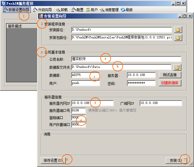 点击PushIM服务程序工具栏上的“安装设置向导”按钮,弹出以下安装设置向导框,安装过程将在这个框中完成。
