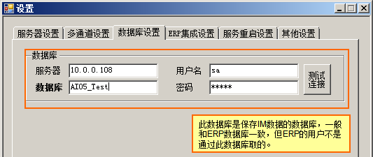 - 检查数据库设置。在PushIM服务安装时已经指定过数据库连接,一般不需要修改,在这里要切到数据库设置标签页中,再确认一下是否有误,即是否是希望将PushIM数据保存的数据库,通常情况下为对应ERP数据库。如果有误请手动修改正确。